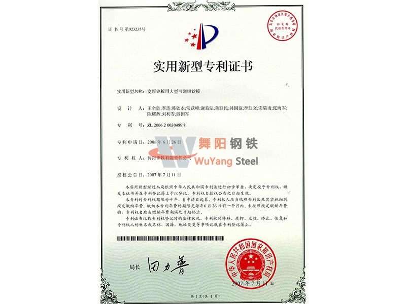 舞陽鋼鐵公司寬厚鋼板用大型可調(diào)鋼錠模-實用新型專利證書